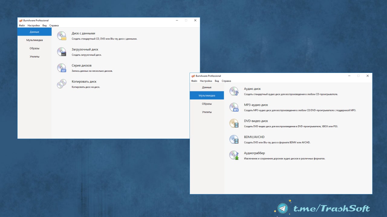 BurnAware — простая и удобная программа для записи и копирования дисков. Поддерживается большинство современных бубликов - от CD до Blu-ray. Основные функции: запись дисков с данными, загрузочных дисков, копирование, создание аудио- и видео-дисков, аудиограббер.