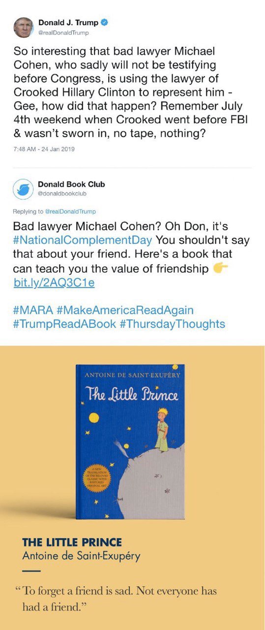 Кейс: Перед интернет магазином книг стояла задача увеличить продажи среди поколения миллениалов. Согласно статистике, за прошедший год только 19% прочитали хотя бы одну книгу за прошедший год, однако каждый, кто принял участие в опросе, признался, что читал твиттер Трампа. Это послужило идеей для новой кампании, в которой его твиттер используется для продвижения книг. Например, когда Трамп публикует твит о сексуальном насилии - книжный клуб Дональда публикует книгу по соответствующей тематике, которую можно сразу приобрести, перейдя по ссылке. "Make America read again", надеемся, через некоторое время появится статистика с результатами этой кампании.