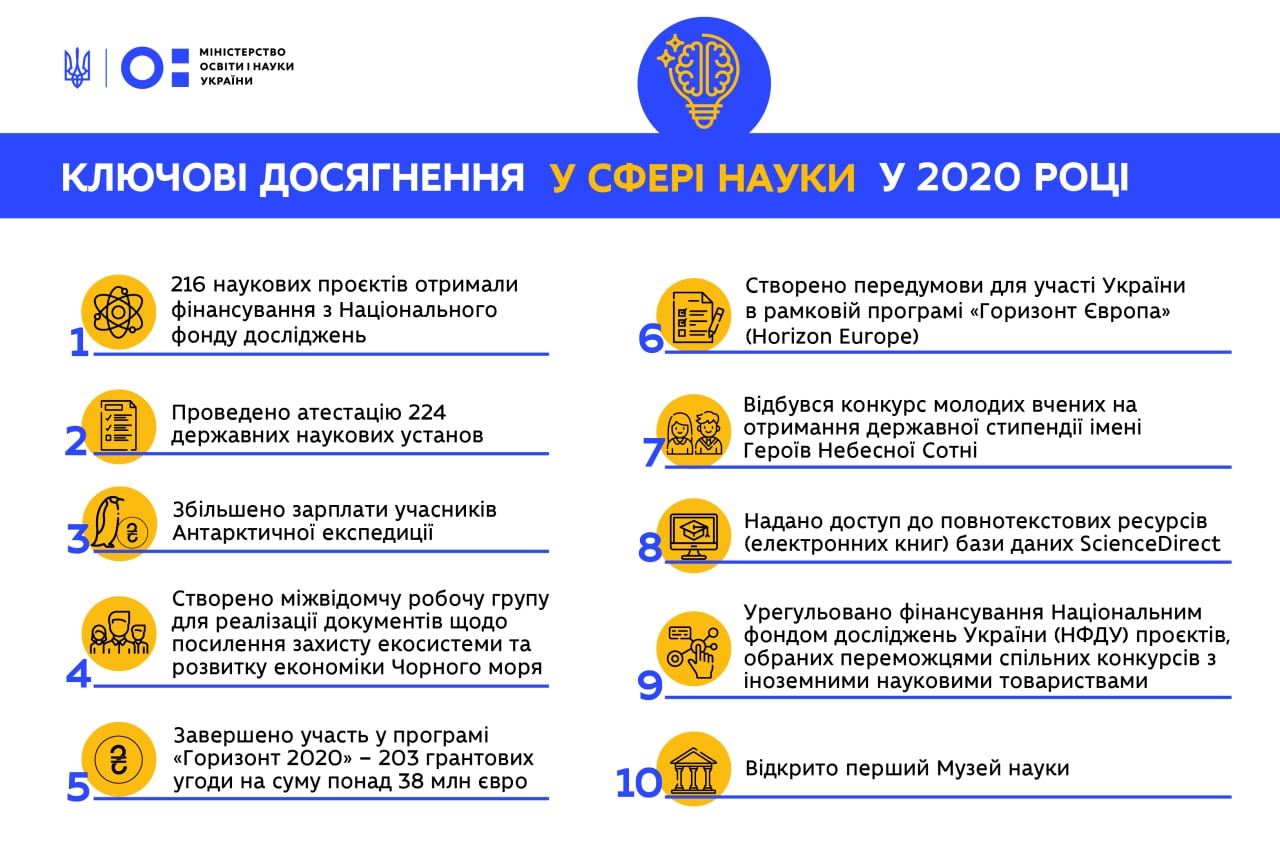 У 2020 році Національним фондом досліджень підбито підсумки наукових конкурсів та обрано 216 проєктів, на які спрямовано 255,3 млн грн грантового фінансування, та вперше за 20 років вдалося суттєво вдалося підвищити оплату праці полярників.