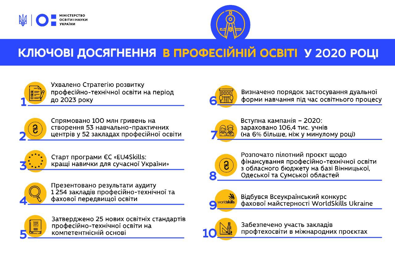 У 2020 році було спрямовано 100 млн гривень на створення 53 навчально-практичних центрів, затверджено 25 нових освітніх стандартів на компетентнісній основі та схвалено Стратегію розвитку професійної (професійно-технічної) освіти до 2023 року. Крім цього, МОН підтримало реалізацію програми ЄС EU4Skills, у межах якої, зокрема, було проведено аудит 1254 закладів професійно-технічної та фахової передвищої освіти.