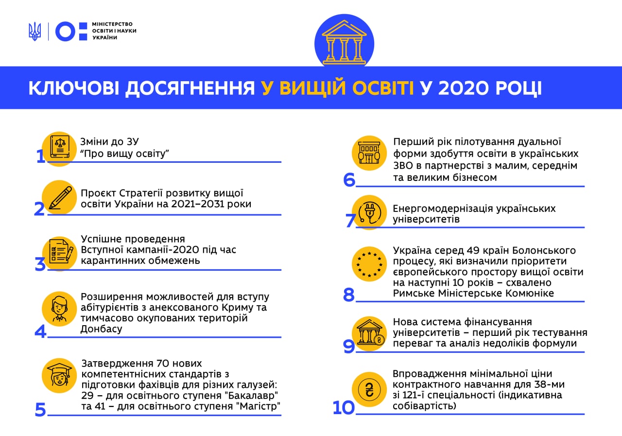 У 2020 році набули чинності зміни до ЗУ «Про вищу освіту», зокрема щодо вимог до керівників ЗВО, ліцензування, дуальної освіти, міждисциплінарності та дотримання академічної доброчесності. Крім того, відбувалося тестування й аналіз недоліків системи фінансування університетів, затверджено 70 нових компетентнісних освітніх стандартів, розпочато пілотування дуальної форми навчання, визначено ключові напрями розвитку вищої освіти до 2031 року.
