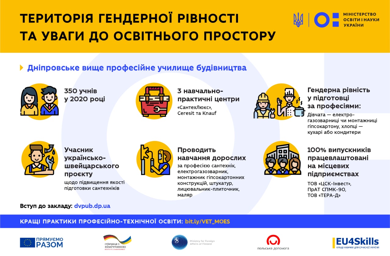 У Дніпровському ВПУ будівництва дівчата навчаються на електрогазозварниць, столярок, монтажниць гіпсокартону та слюсарок. Тоді як хлопці тут охоче вчаться на кухарів чи кондитерів. У закладі створили атмосферу гендерної рівності, щоб кожен вступник обирав професію за власними уподобаннями та інтересами, а не переймався через стереотипи щодо обраного напряму.