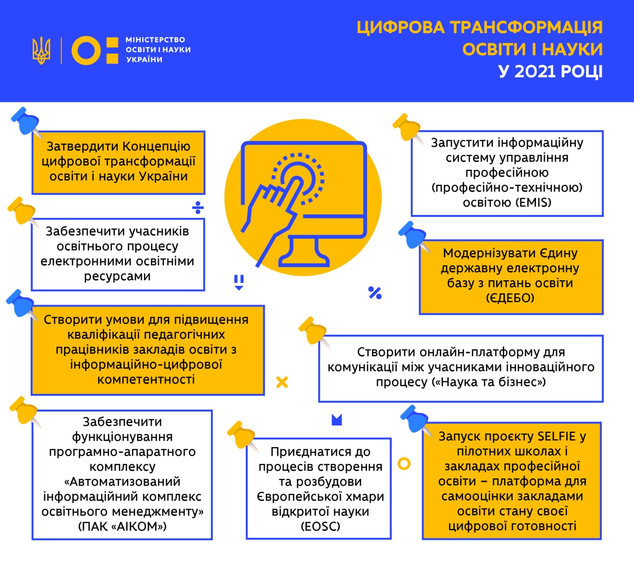 У середу, 3 лютого 2021 року, на засіданні Комітету Верховної Ради з питань освіти, науки та інновацій Міністр освіти і науки Сергій Шкарлет розповів про ключові завдання, які ставить перед собою МОН на 2021 рік. Зокрема, впровадження цифрової трансформації освіти і науки є одним з пріоритетних напрямів роботи Міністерства.