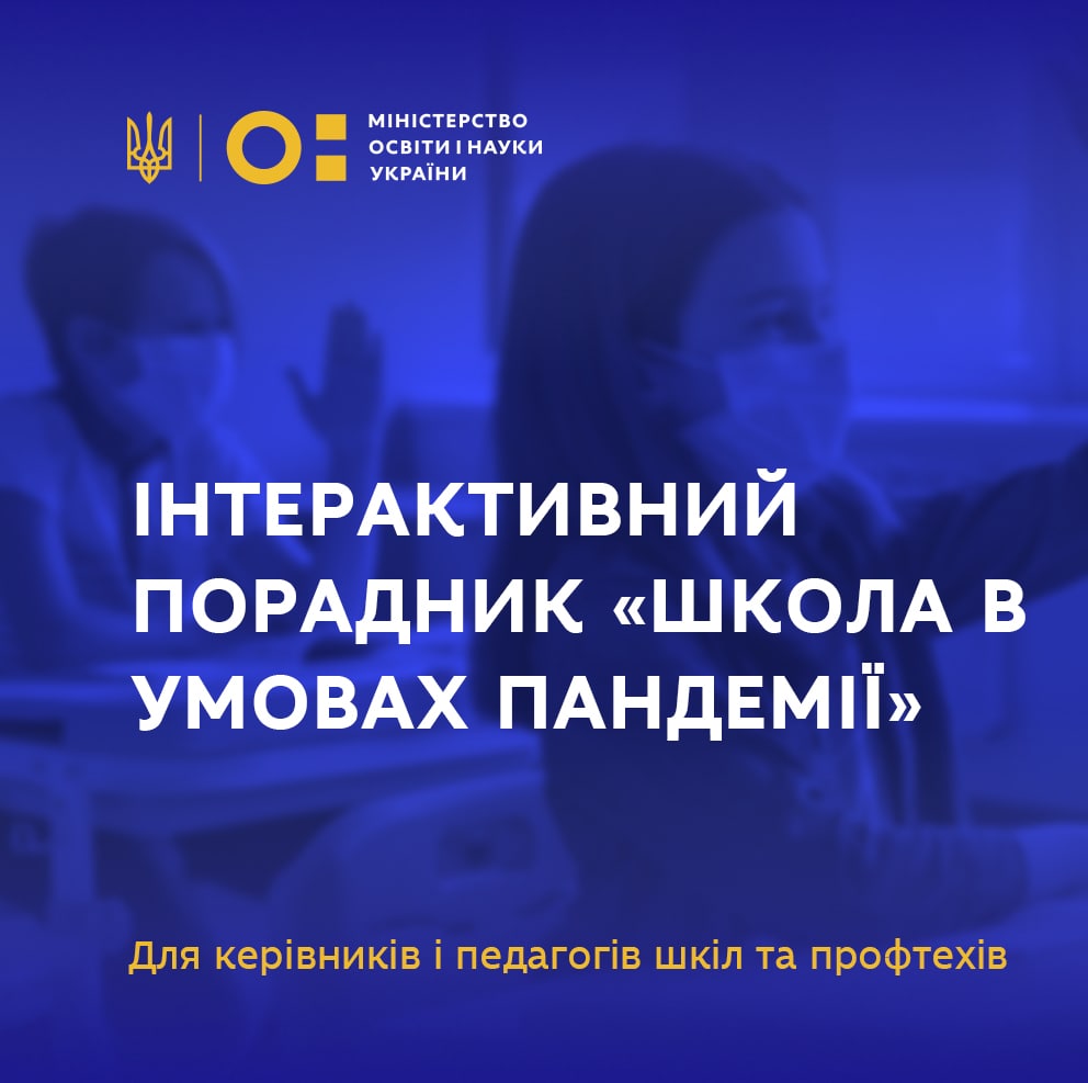 МОН спільно з Дитячим фондом ООН (ЮНІСЕФ) та за участі міжнародних партнерів із Центру SeeD розробили інтерактивний порадник «Школа в умовах пандемії» для керівників і колективів закладів загальної середньої та професійної (професійно-технічної) освіти.