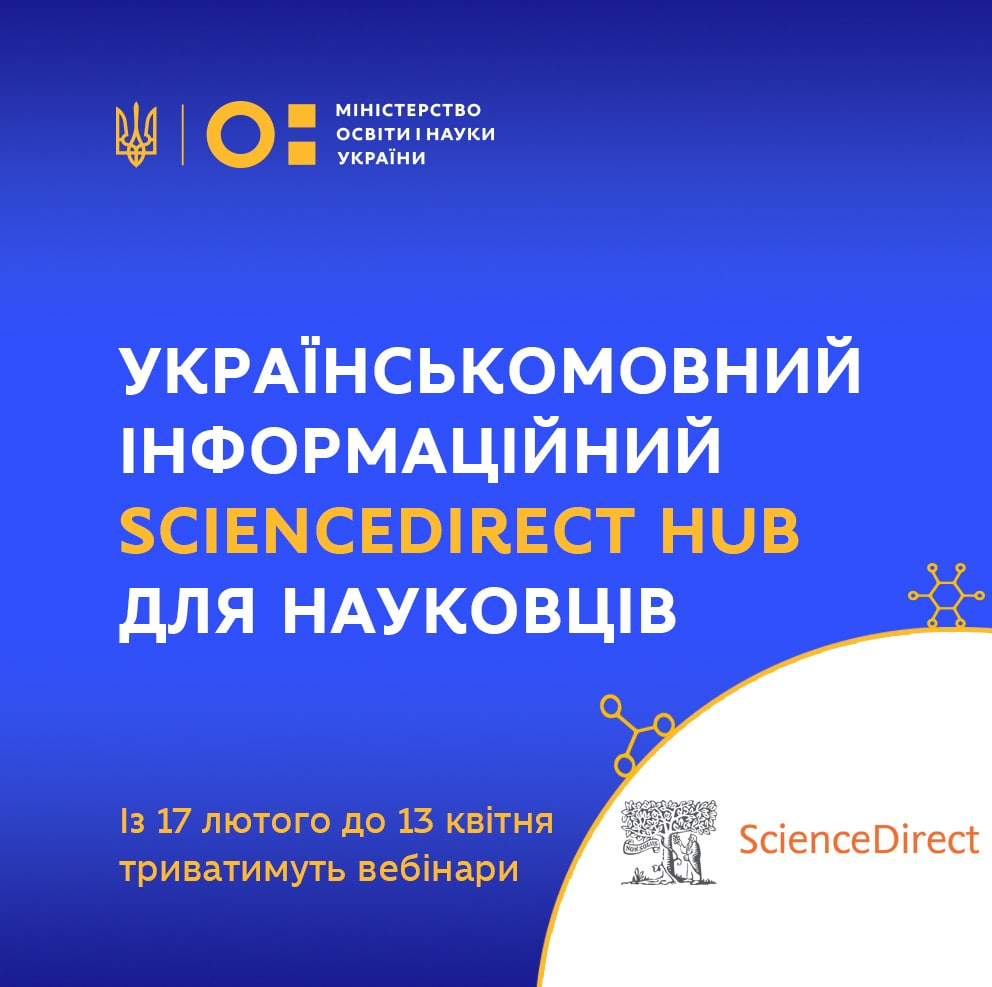 У середу, 17 лютого, відбудеться презентація українськомовного інформаційного ScienceDirect hub для розширення знань науковців щодо використання можливостей продукції компанії Elsevier. Протягом лютого-квітня 2021 року заплановано провести серію вебінарів.