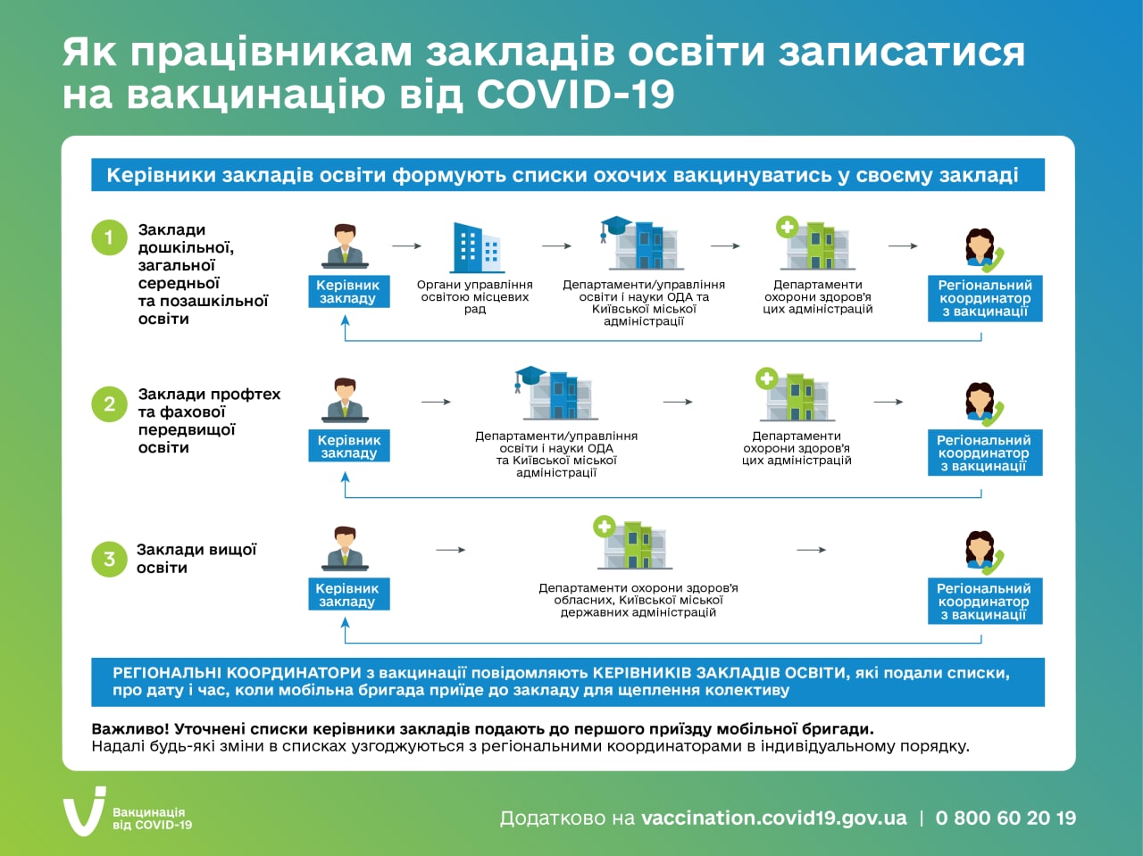 Працівників освіти, які залучені до проведення ЗНО, вакцинують організовано мобільними бригадами з імунізації. Список охочих вакцинуватися формує керівник закладу освіти та передає його до департаментів охорони здоров’я обласних, Київської міської державних адміністрацій. Вони, своєю чергою, узагальнюють списки та передають їх регіональним координаторам з вакцинації для подальшого планування виїзду мобільної бригади. За планування графіку виїздів мобільних бригад відповідають регіональні координатори з вакцинації. Вони повідомляють керівникам закладів освіти дату та час приїзду мобільної бригади.