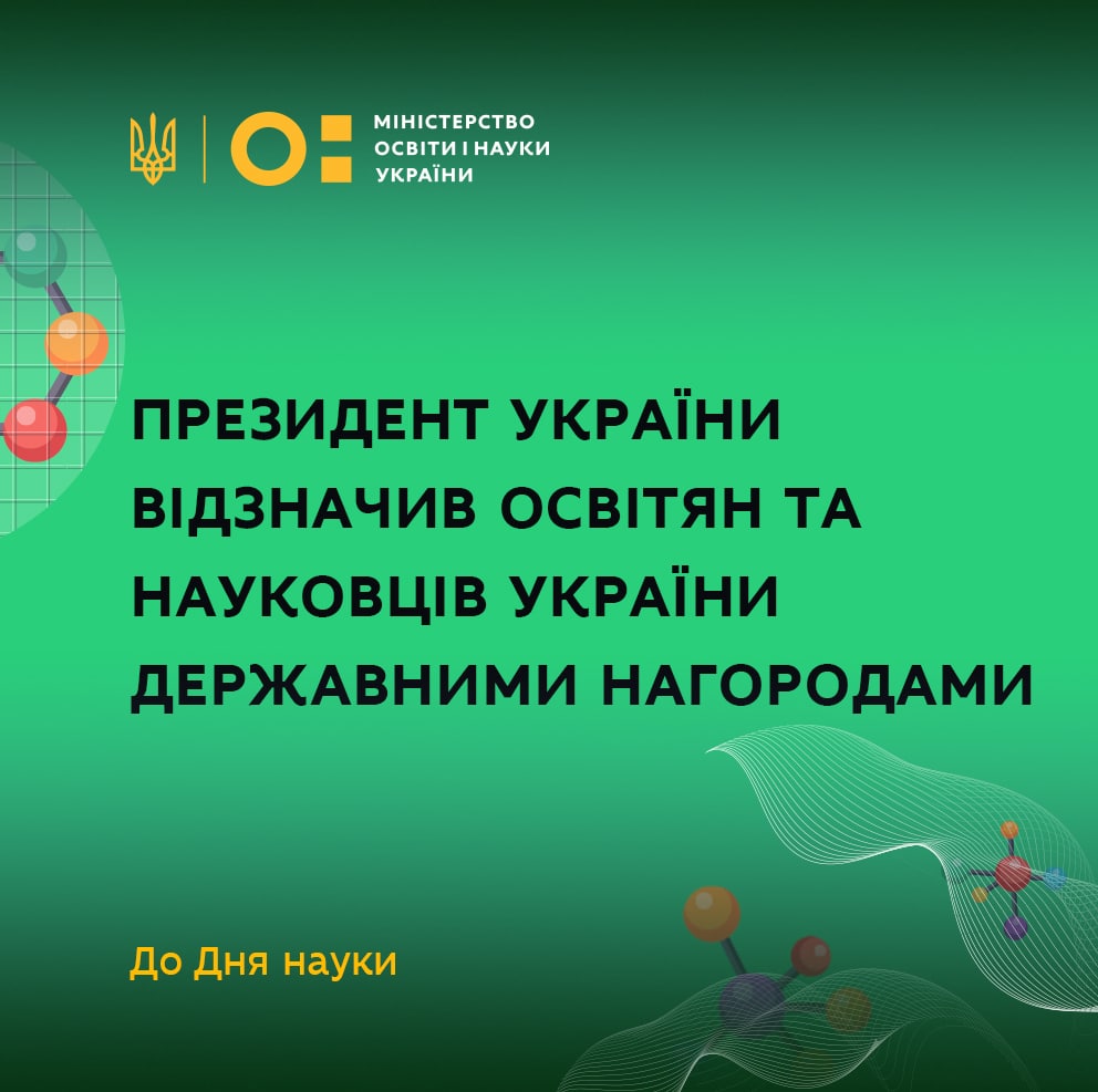 За вагомий особистий внесок у розвиток вітчизняної науки, зміцнення науково-технічного потенціалу України, багаторічну сумлінну працю та високий професіоналізм Президент України Володимир Зеленський відзначив державними нагородами освітян України з нагоди Дня науки.