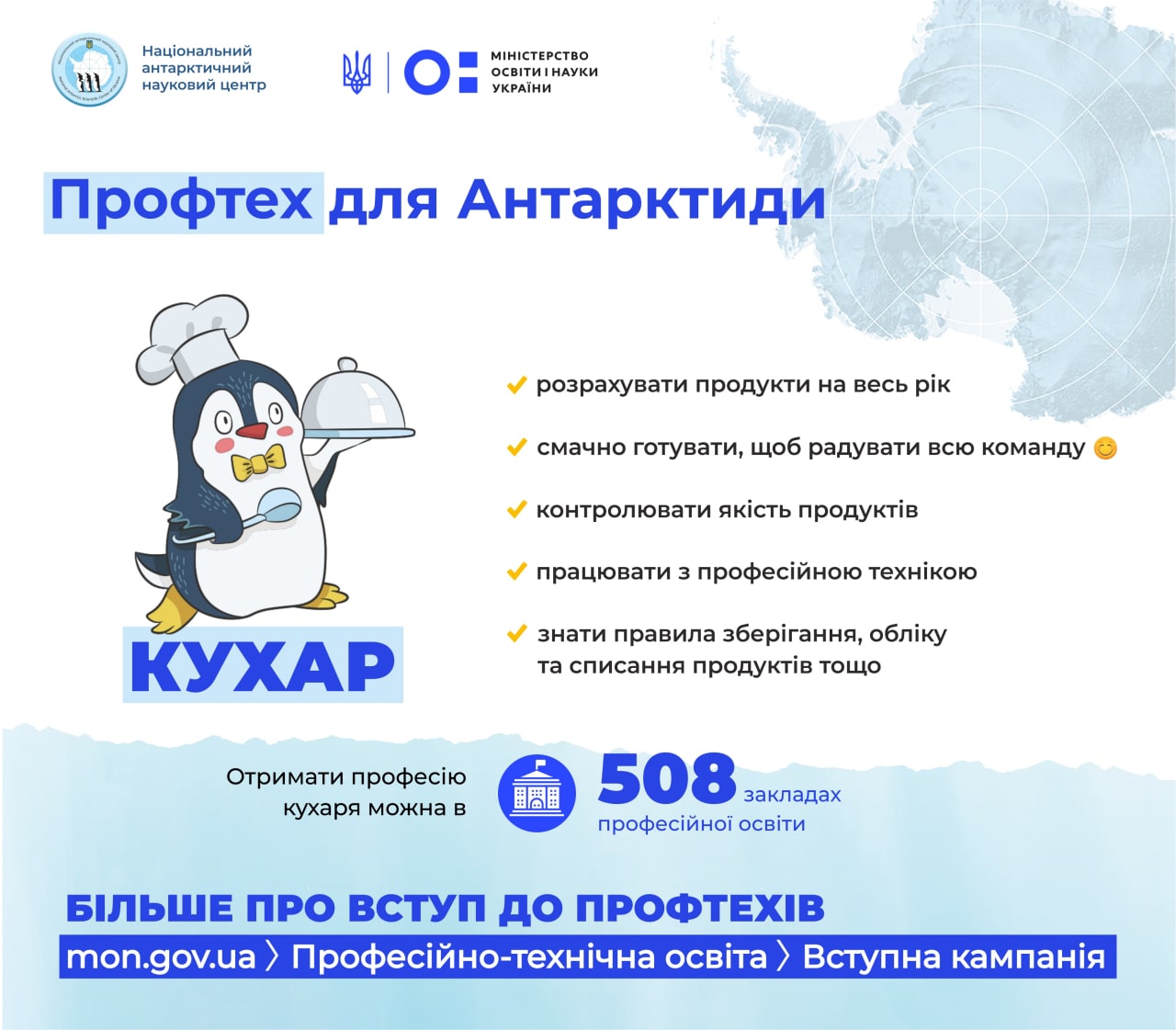 📢 Якщо ви завжди мріяли працювати в Антарктиді, але не бачите себе в науці, маємо для вас гарну новину! Для роботи на станції «Академік Вернадський» потрібні не тільки дослідники, а й команда життєзабезпечення. До неї, зокрема, відбирають фахівців із професійно-технічною освітою, яку можна здобути всього за рік (на базі 11-ти класів) або ж за 3 роки (на базі 9-ти класів).