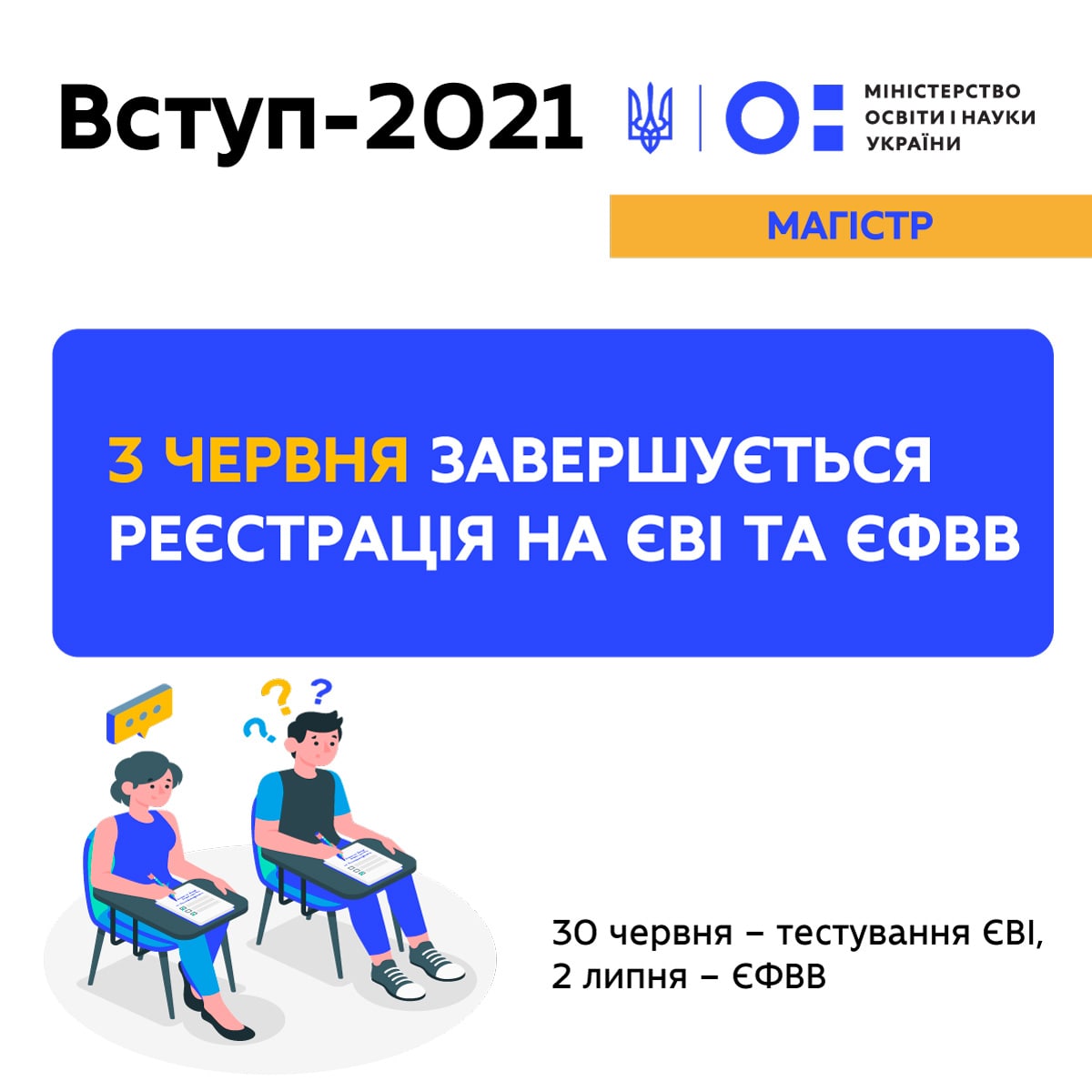 Завтра, 3 червня, о 18.00 завершується реєстрація вступників, які планують складати єдиний вступний іспит з іноземної мови (ЄВІ) та єдине фахове вступне випробування (ЄФВВ) для вступу на навчання для здобуття ступеня магістра. ЄФВВ складають вступники на спеціальності «Право» і «Міжнародне право».