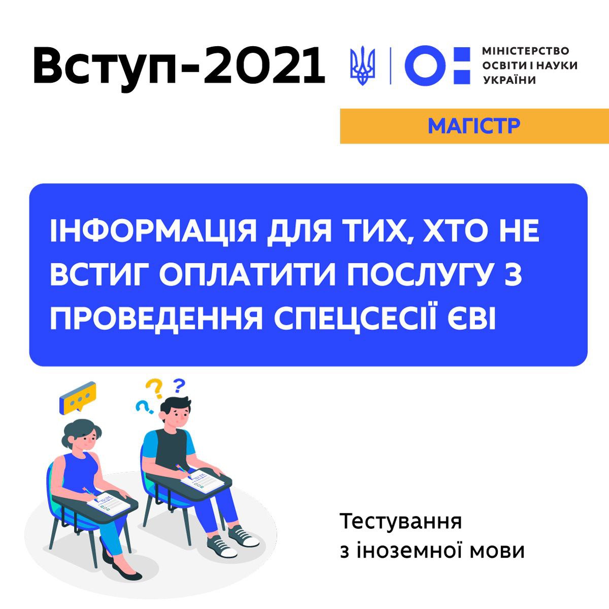 Учасники спеціально організованої сесії єдиного вступного іспиту (тестування з іноземної мови для вступу до магістратури), які ще не встигли здійснити оплату, можуть це зробити до 26 серпня включно.
