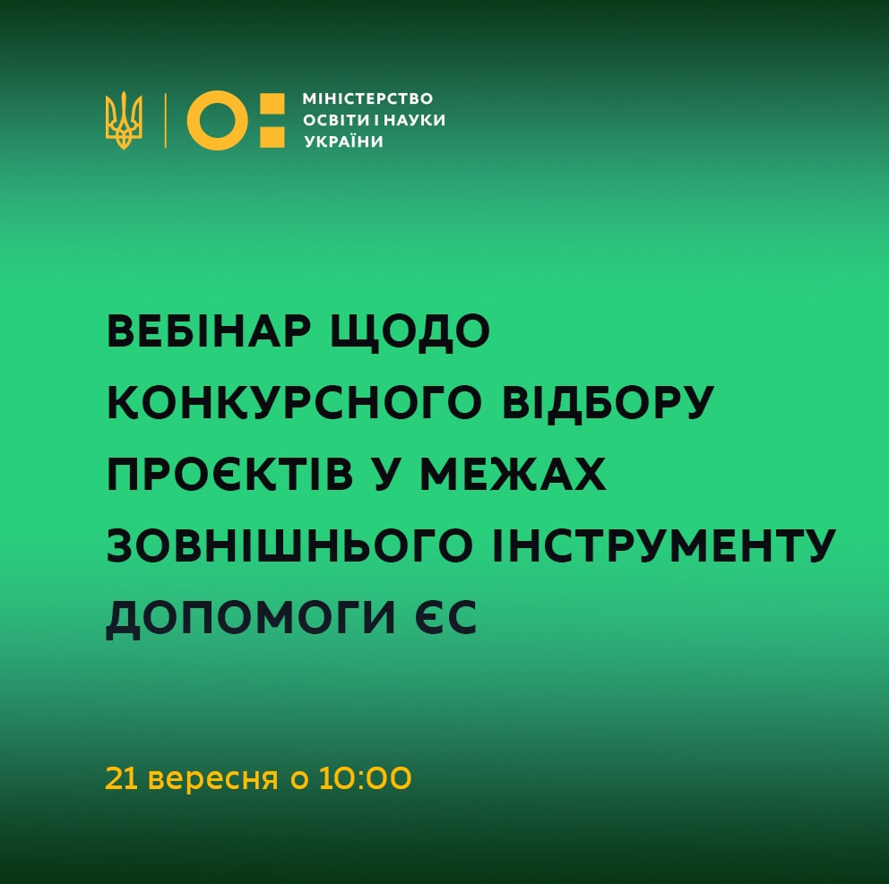 📢 21 вересня о 10:00 відбудеться вебінар щодо запуску Міністерством освіти і науки України конкурсного відбору проєктів, які фінансуються за рахунок зовнішнього інструменту допомоги ЄС.