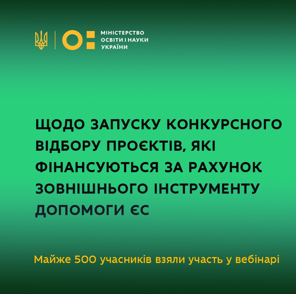 21 вересня 2021 року відбувся вебінар щодо запуску Міністерством освіти і науки України конкурсного відбору проєктів, які фінансуються за рахунок зовнішнього інструменту допомоги Європейського Союзу.