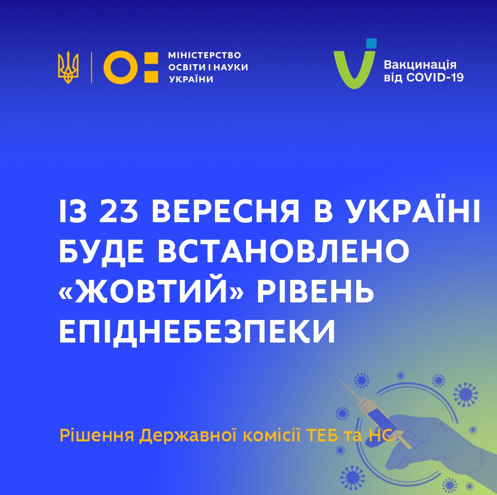 Сьогодні відбулося позачергове засідання Державної комісії з питань техногенно-екологічної безпеки та надзвичайних ситуацій. За результатами засідання Комісія вирішила, зокрема, встановити з 00 год 00 хв 23 вересня 2021 року «жовтий» рівень епідемічної небезпеки поширення COVID-19 на території всіх регіонів України. У зв'язку з цим у закладах освіти запроваджуються карантинні обмеження, які визначені постановою Уряду №1236 від 9 грудня 2020 року (зі змінами).