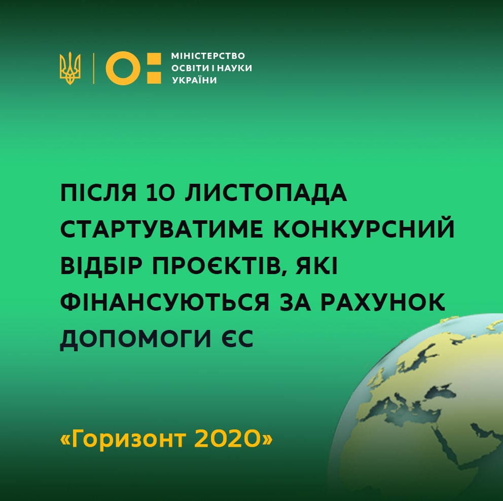 Конкурс наукових, науково-технічних робіт та проєктів, які фінансуються за рахунок зовнішнього інструменту допомоги Європейського Союзу для виконання зобов’язань України у Рамковій програмі Європейського Союзу з наукових досліджень та інновацій «Горизонт 2020» буде оголошено після 10 листопада 2021 року.