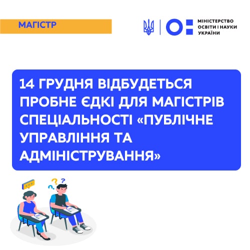 14 грудня 2021 року магістри другого року навчання за спеціальністю «Публічне управління та адміністрування» складатимуть апробаційний єдиний державний кваліфікаційний іспит у 35 містах України.