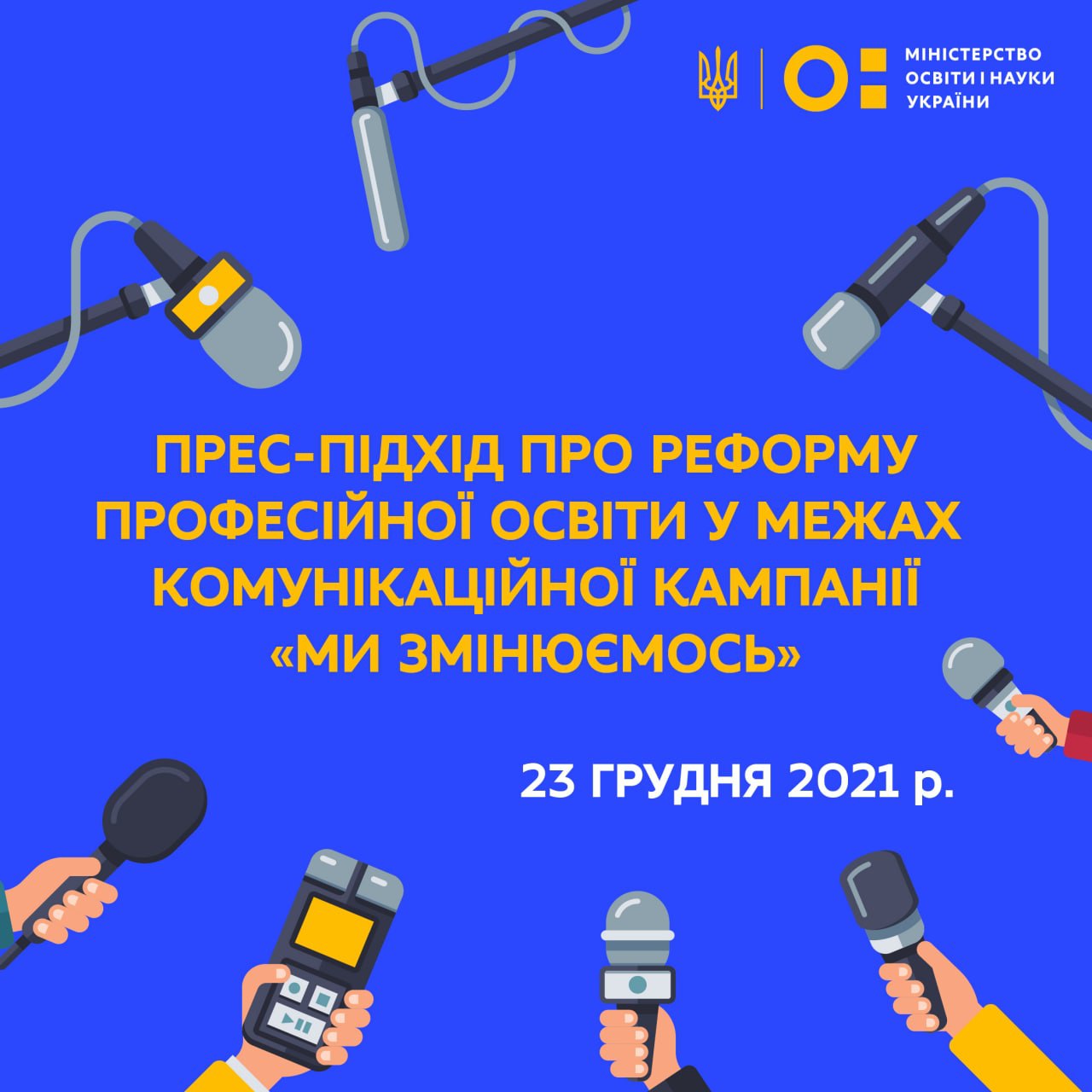 📢 23 грудня 2021 року у межах комунікаційної кампанії “Ми змінюємося” відбудеться прес-підхід про підсумки реформи професійної освіти. Учасники розкажуть про цілі та завдання реформи, а також цьогорічні результати.