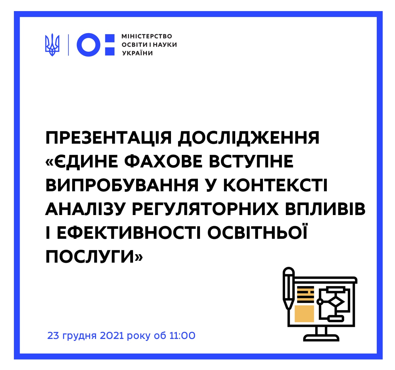 📢 23 грудня 2021 року відбудеться презентація аналітичного дослідження «Єдине фахове вступне випробування у контексті аналізу регуляторних впливів і ефективності освітньої послуги» за участю Міністра освіти і науки України Сергія Шкарлета.