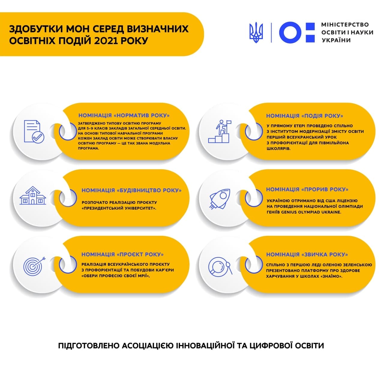 Серед ключових здобутки МОН – затвердження Типової освітньої програми для 5-9 класів, будівництво Президентського університету, впровадження Всеукраїнського проєкту з профорієнтації та побудови кар’єри, а також проведення першого Всеукраїнського уроку із профорієнтації, який став наймасовішим уроком в Україні та потрапив до Національної Книги Рекордів.