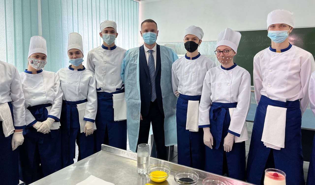 Розпочав поїздку з огляду навчально-практичного центру Державного професійно-технічного навчального закладу «Білоцерківське вище професійне училище будівництва та сервісу», , в якому здійснюється підготовка робітничих кадрів за професіями «Кухар» і «Кондитер». Центр створено у 2020 році, обсяг загального фінансування – 2 млн 428,7 тис. грн із державного та обласного бюджетів.
