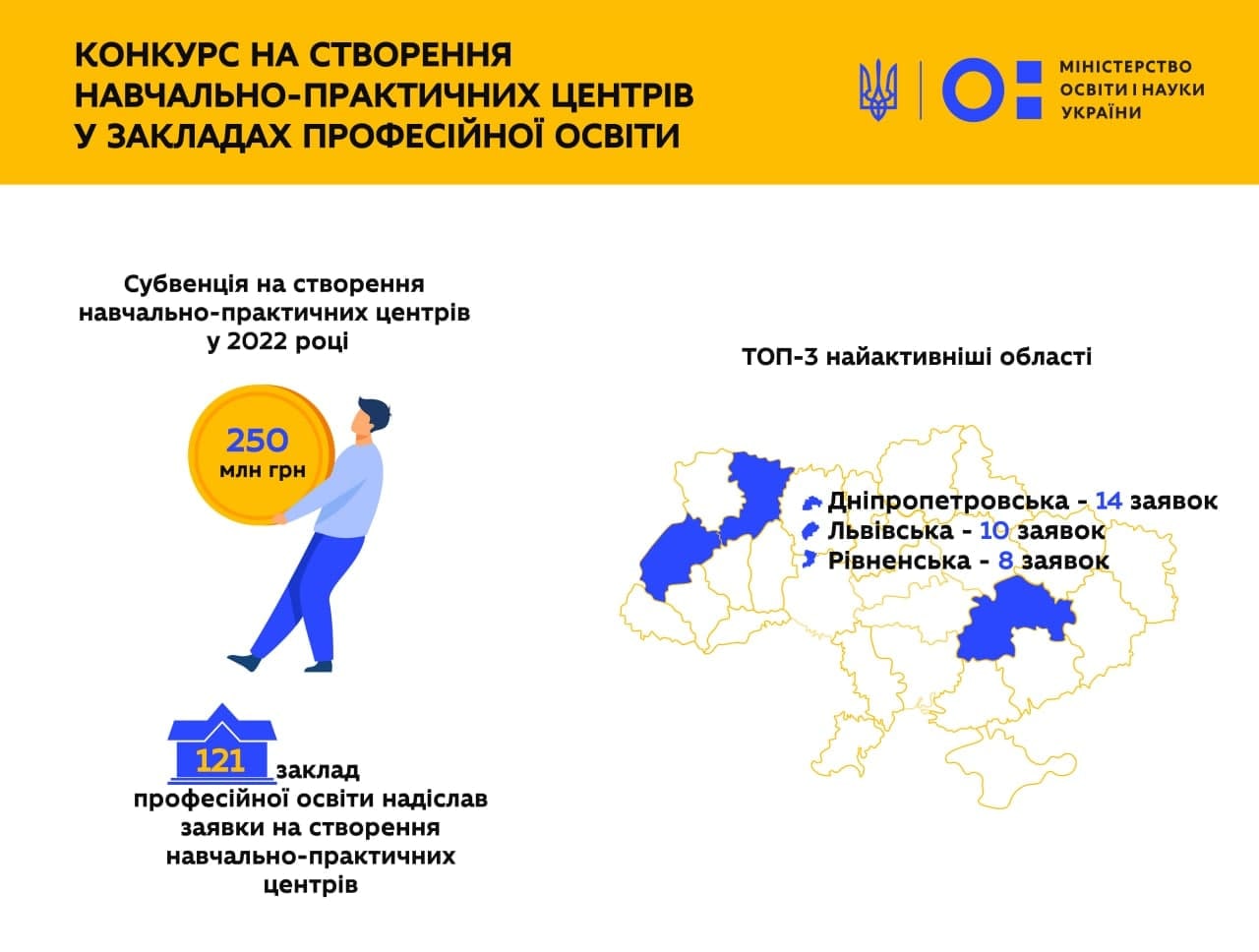 129 проєктів на створення навчально-практичних центрів від 121 закладу професійної освіти отримано Міністерством освіти і науки у 2022 році. Впродовж лютого-березня комісія обере щонайменше половину профтехів, у яких будуть створені навчальні осередки.