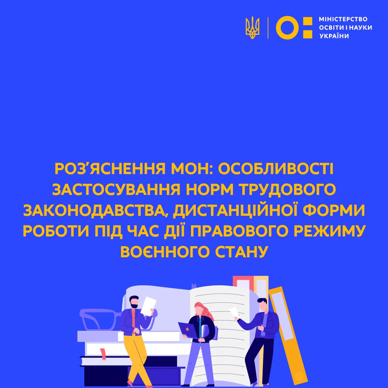У зв’язку із численними зверненнями, що надходять до МОН щодо особливостей застосування норм трудового законодавства, дистанційної форми роботи під час дії правового режиму воєнного стану, Керівникам департаментів (управлінь) освіти і науки обласних, Київської міської державних (військово-цивільних) адміністрацій, а також керівникам закладів освіти надіслані чергові роз’яснення.