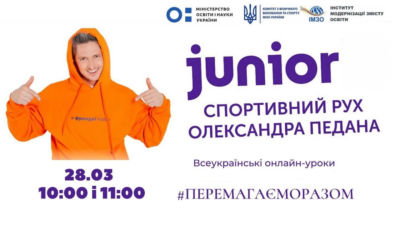 📢 Сьогодні, 28 березня 2022 року, спільнота вчителів Junior разом із Міністерство освіти і науки України, Інститутом модернізації змісту освіти та Комітетом фізичного виховання та спорту розпочинає серію онлайн-уроків #перемагаєморазом, які входять до Всеукраїнського розкладу. Трансляція відеоуроків для школярів 5-11 класів відбуватиметься на телеканалах ПЛЮСПЛЮС, «Піксель» та «Суспільне», а також платформах онлайн-телебачення MEGOGO, Київстар ТБ, 1+1 video, sweet. tv та VoliaTV.