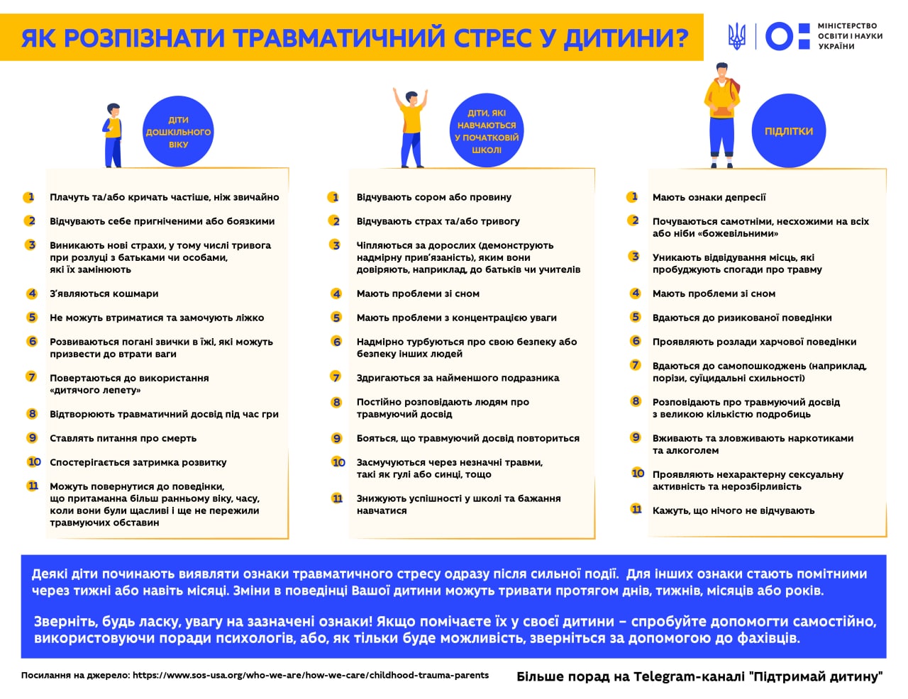 Дехто виявляє ознаки травматичного стресу одразу після сильної події, хтось – через тижні або навіть місяці. Зміни в поведінці Вашої дитини можуть тривати протягом днів, тижнів, місяців або років.