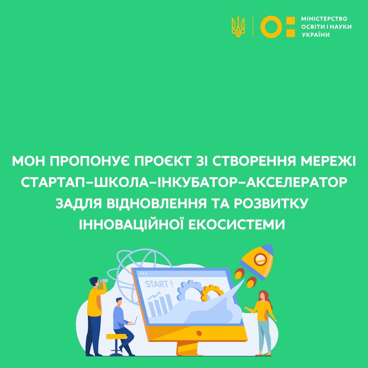 МОН пропонує запровадити експериментальний проєкт зі створення на базі закладів вищої освіти та наукових установ мережі стартап-школа-інкубатор-акселератор задля відновлення та розвитку інноваційної екосистеми. Відповідний проєкт постанови Кабінету Міністрів України та документи до нього розміщені для громадського обговорення на офіційному сайті МОН.