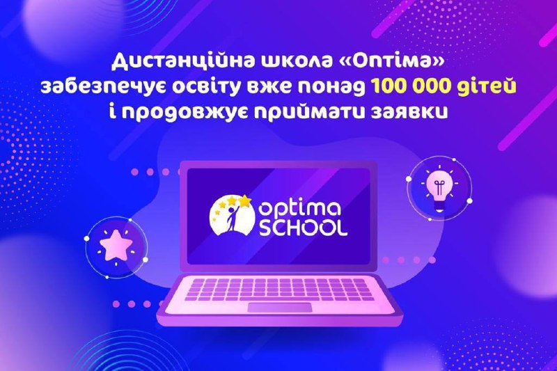 Перша та найбільша дистанційна школа України «Оптіма» надає можливість безоплатно навчатися для понад 100 тис. дітей. Онлайн-заклад продовжує приймати заявки на навчання, а завдяки співпраці з Міністерством освіти і науки України усі діти зможуть отримати документи про освіту.
