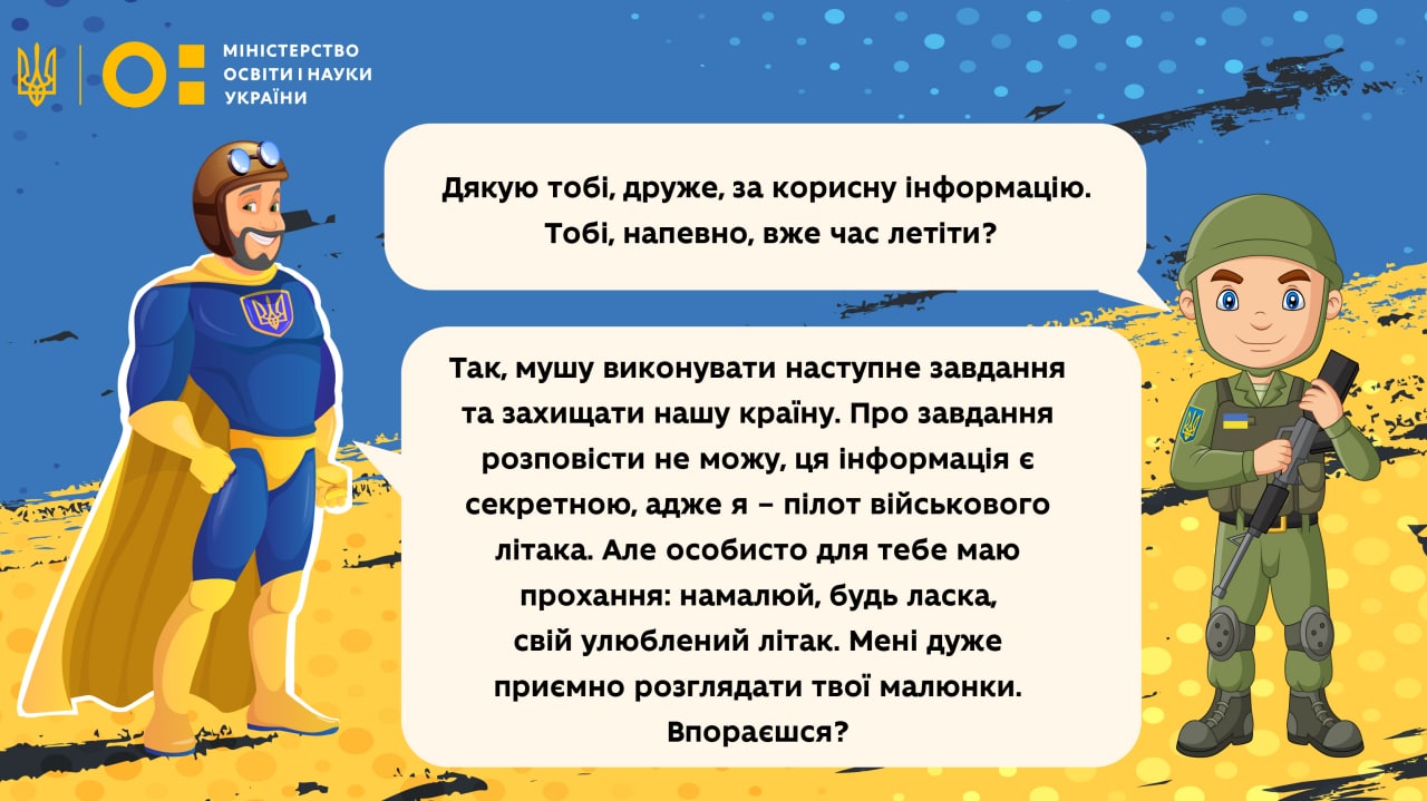 Чи цікаво тобі з пілотом? У нього обмаль часу, бо має захищати нашу країну. Зроби приємність пілоту: намалюй йому на пам‘ять свій улюблений літак!