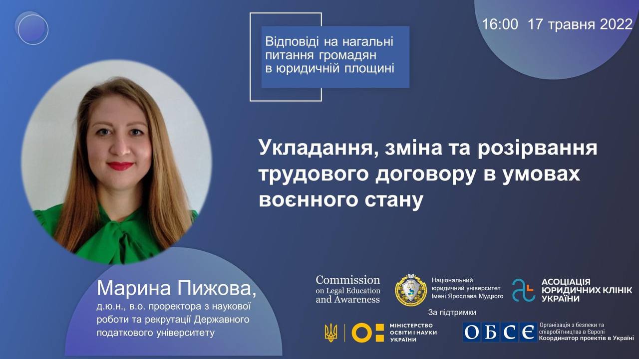 Завтра, 17 травня 2022 року, відбудеться вебінар на тему «Укладання, зміна та розірвання трудового договору в умовах воєнного стану».