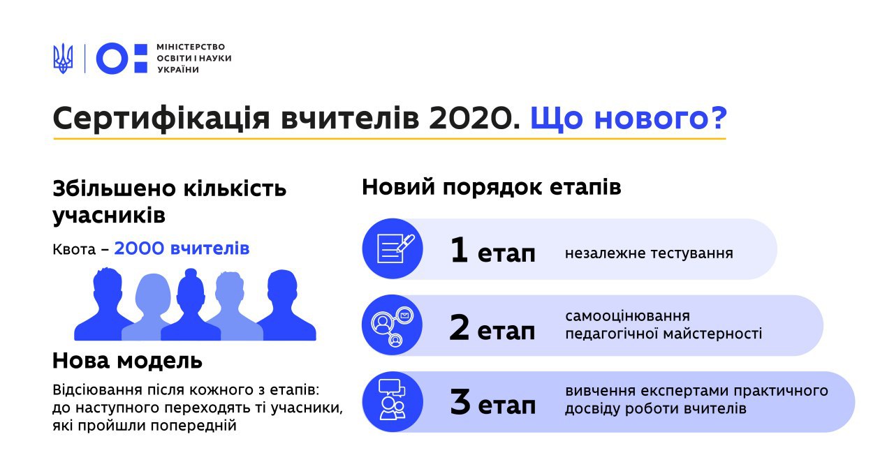 Сертифікація-2020 відбуватимуться за новим порядком. Першим етапом буде незалежне тестування – «ЗНО для вчителів». Наступним – самооцінювання учасниками сертифікації власної педагогічної майстерності. Останнім етапом стане вивчення експертами практичного досвіду роботи учасників сертифікації.