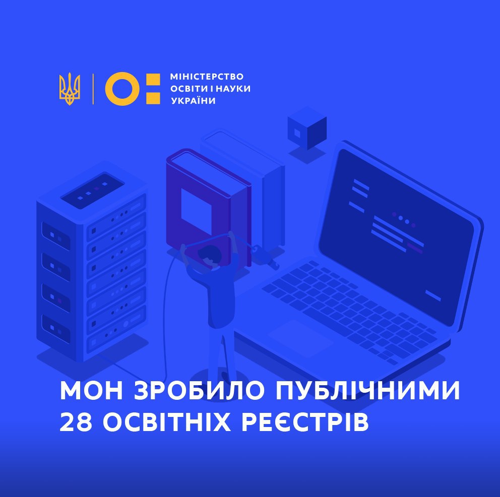 Серед оприлюднених реєстрів – переліки закладів освіти всіх рівнів, а також наукових установ, реєстри документів про загальну середню, професійно-технічну та вищу освіту, національний репозитарій текстів, реєстри технологій, створених чи придбаних за бюджетні кошти тощо.