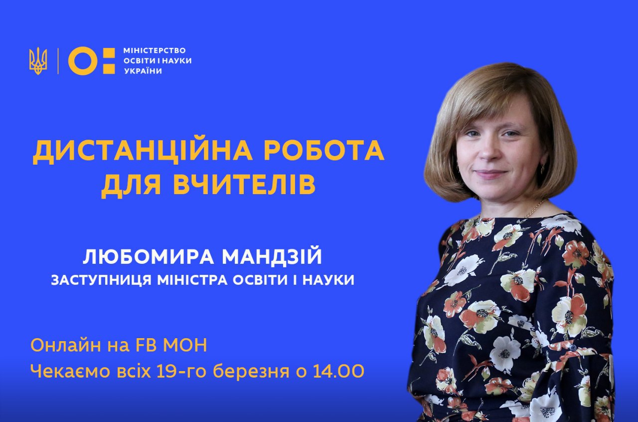 Заступниця Міністра освіти і науки Любомира Мандзій розповість про організацію роботи педагогів у період карантину, а також відповість на запитання під час онлайн-трансляції на нашій Facebook-сторінці.