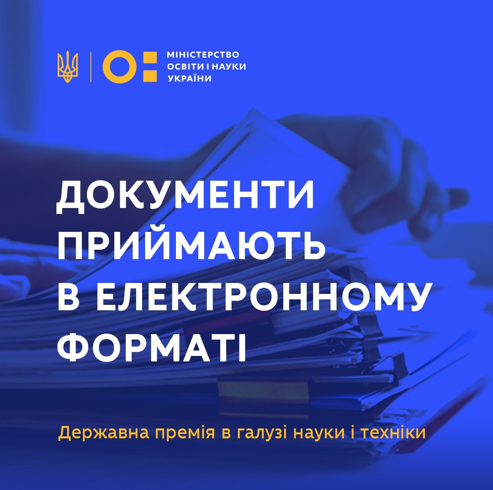У зв'язку з карантином та обмеженням транспортного сполучення для реєстрації приймаються електронні версії документів робіт, які висунуто на здобуття Державної премії України в галузі науки і техніки.