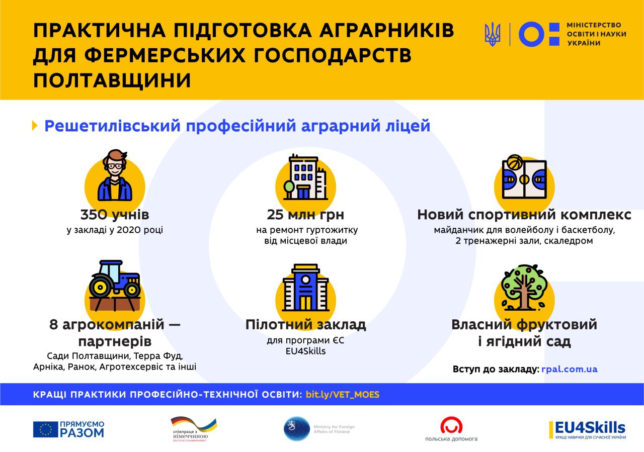 Решетилівський ліцей відібрали для участі у програмі ЄС “EU4Skills: Кращі навички для сучасної України”. Це дозволить їм у співпраці з українськими та європейськими експертами проаналізувати роботу, покращити матеріально-технічну базу та скласти план розвитку.
