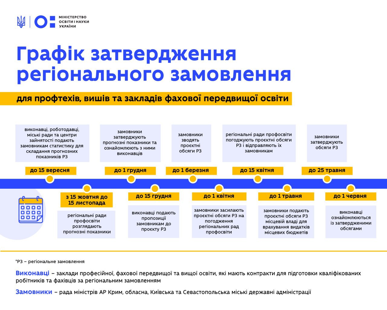 Заклади професійної, фахової передвищої та вищої освіти вже з вересня готуватимуть прогнози для навчання студентів і учнів за кошти регіонального замовлення за оновленими правилами. У них закладений чіткий календар погодження таких обсягів із ключовими гравцями регіональних ринків праці, а також виписані повноваження кожного з них.