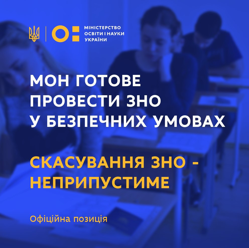 МОН готове до проведення ЗНО у безпечних умовах та відповідно до рекомендацій Головного державного санітарного лікаря України і епідеміологічної ситуації. Скасування ЗНО є неприпустимим, оскільки це єдиний об’єктивний механізм прозорого вступу до вишу, а його відсутність створить значні корупційні ризики.