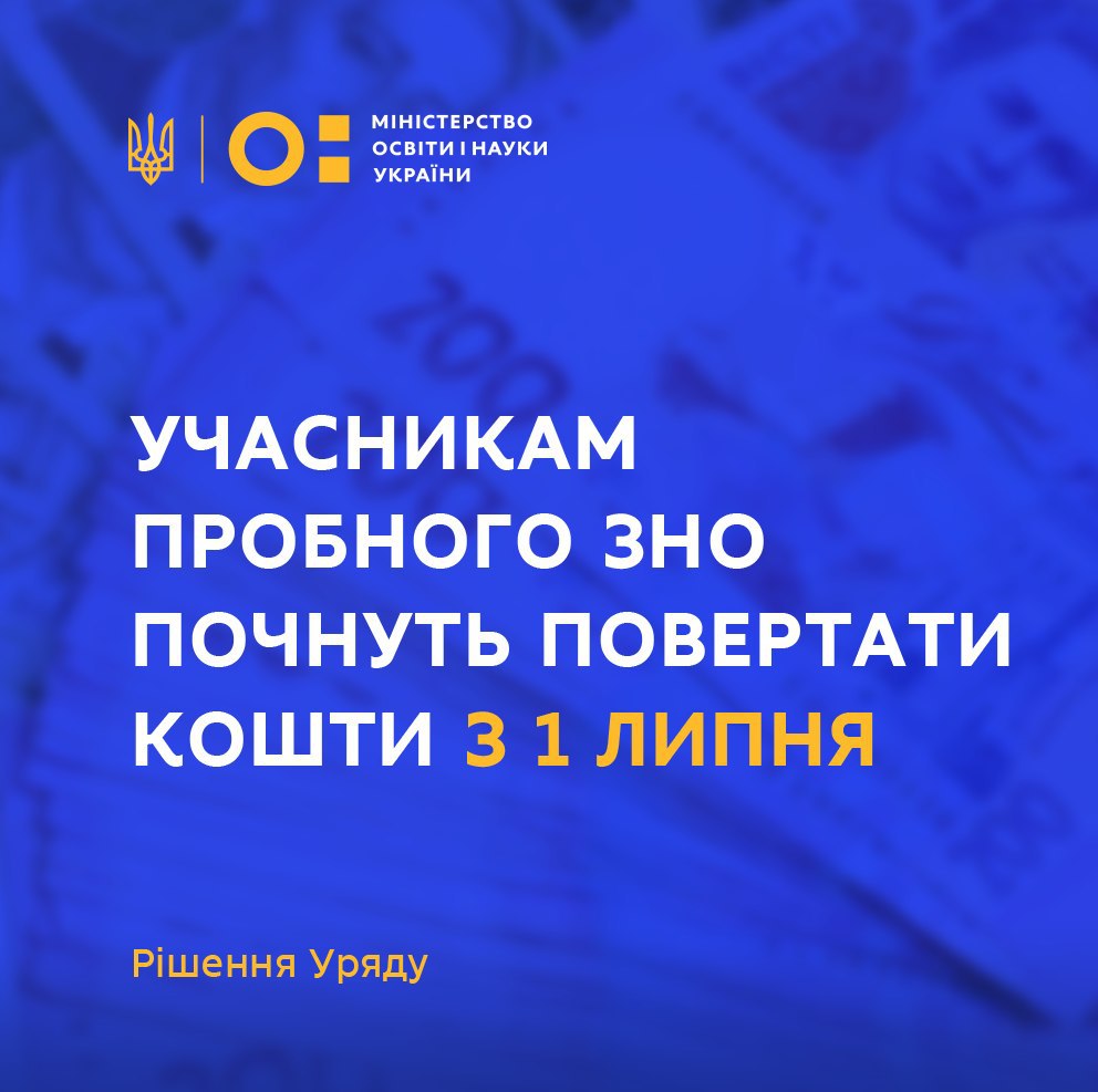 Кошти, сплачені за пробне ЗНО у закладах освіти, повертатимуть учасникам тестування з 1 липня – на це виділено гроші з фонду боротьби з COVID-19.