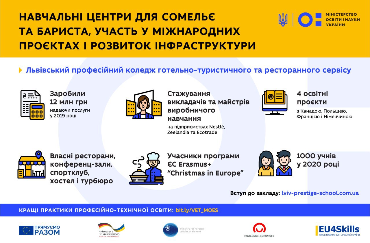 Надаючи послуги впродовж 2019 року, коледж заробив 12 млн гривень. Їх спрямували на оновлення обладнання та ремонт у навчальному ресторані, кухарській та кондитерській лабораторіях, спортивному комплексі та учнівському гуртожитку.