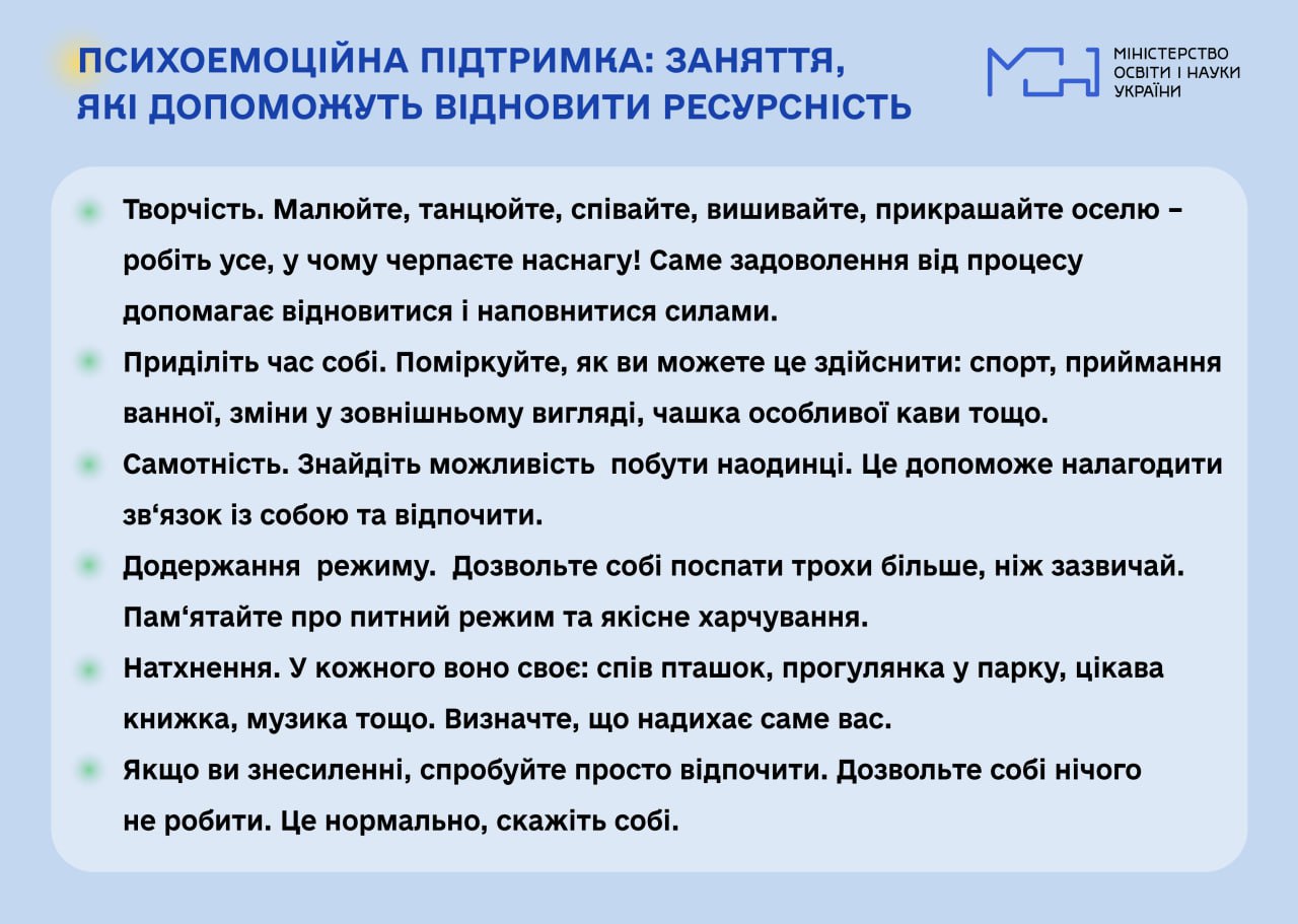 З турботою про батьків та освітян, які підтримують зв’язок з вихованцями, педагоги та дитячі психологи за сприяння Міністерства освіти і науки України запустили телеграм-канал «Підтримай дитину» та «Подбай про себе», де ви зможете знайти поради, техніки, прості рекомендації, ігри та розвивальні вправи, які можна виконувати у сховищі, вдома чи під час евакуації. Матеріали публікуються щоденно.