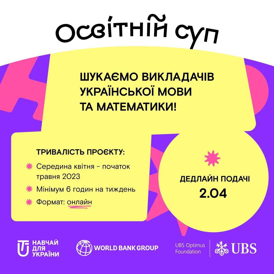 Запрошуємо вчителів української мови та математики доєднатися до онлайн-спільноти тьюторів у межах проєкту «Освітній суп», що реалізується громадською організацією «Навчай для України» у партнерстві зі Світовим банком, за підтримки «UBS Optimus Foundation».