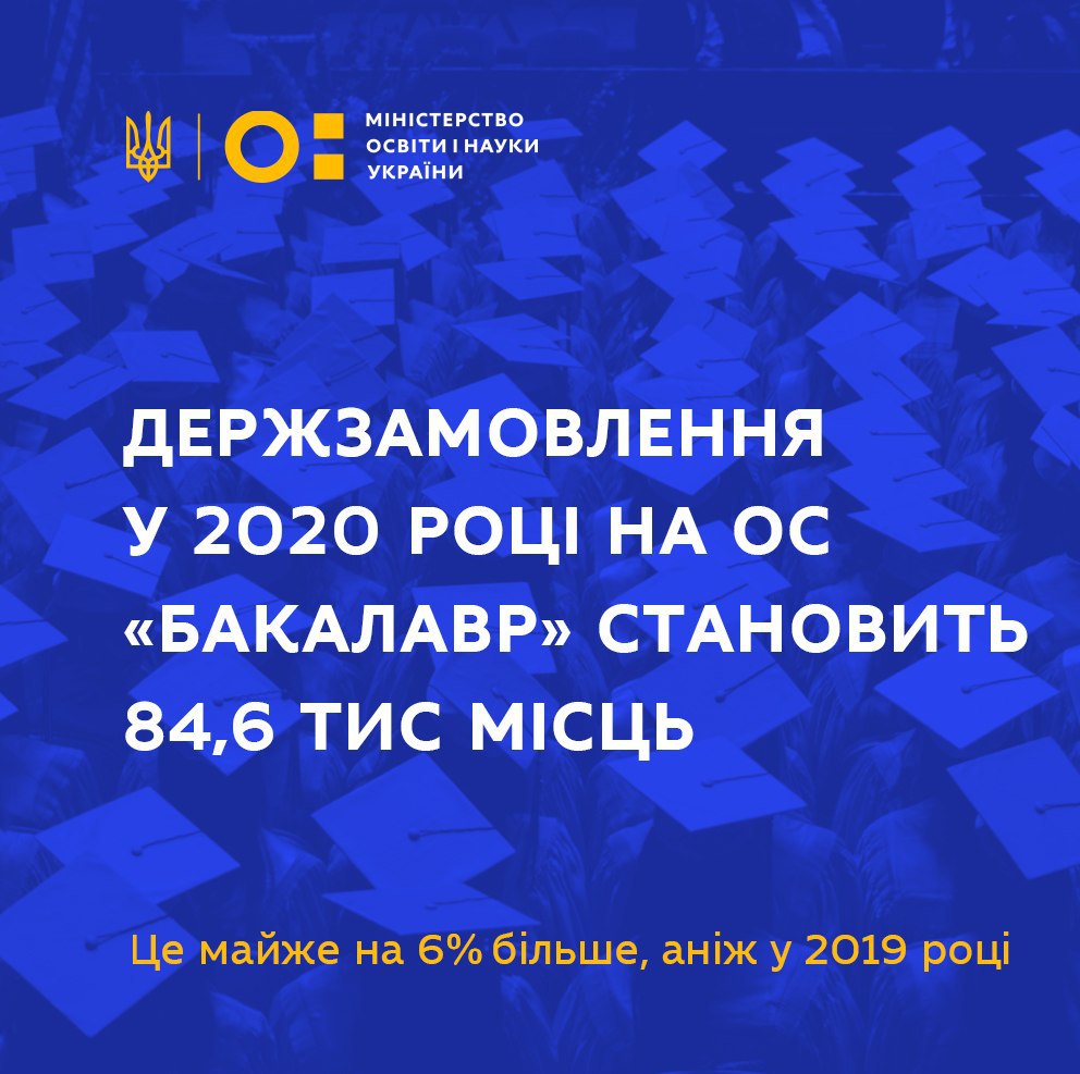 У 2020 році загалом по Україні державне замовлення за освітнім ступенем «Бакалавр» становить 84,6 тис місць (в тому числі за денною формою – 77,6 тис), що на 5,9% більше, ніж у 2019 році.