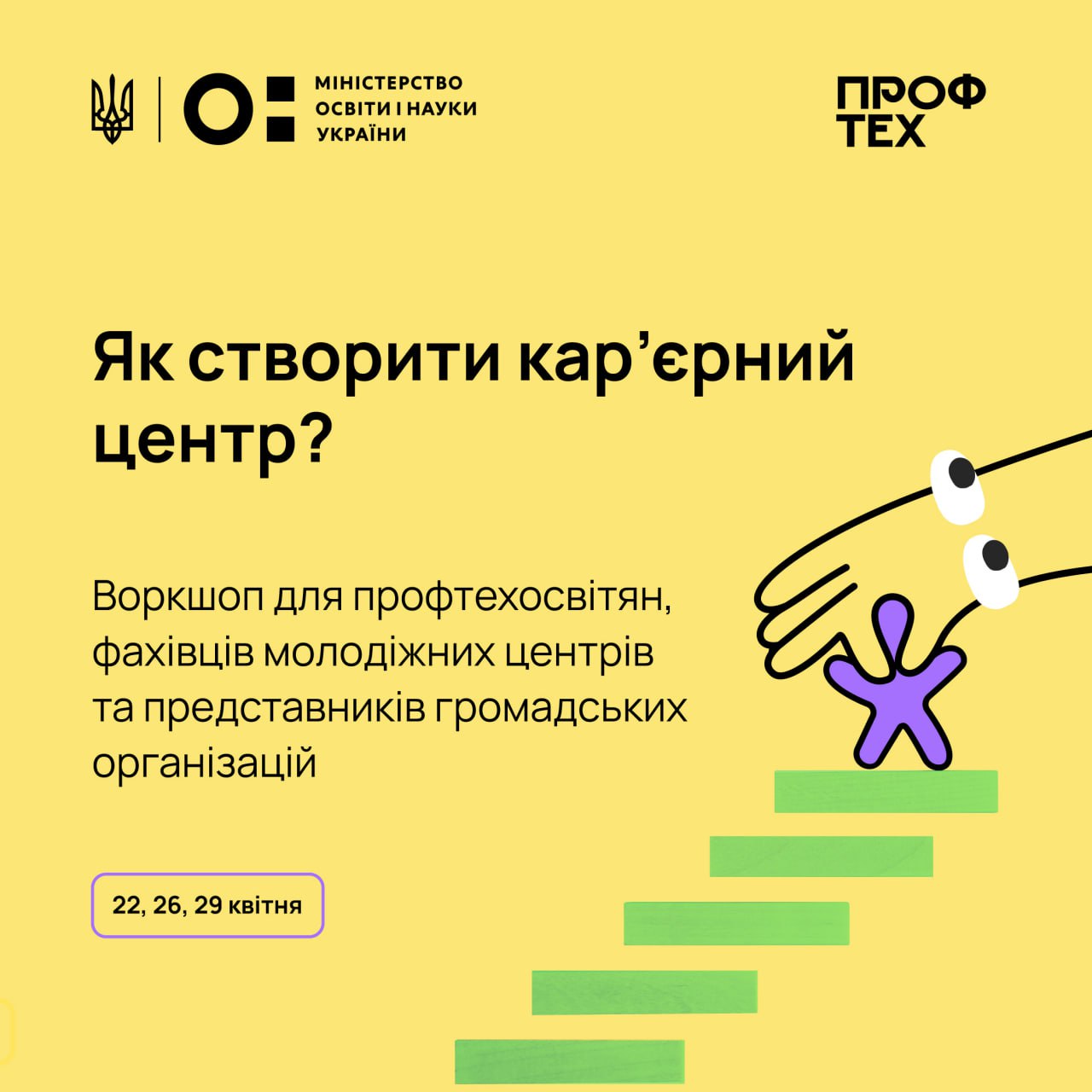 Хей, запрошуємо профтехосвітян, фахівців молодіжних центрів та представників громадських організацій доєднатись до воркшопу щодо організації роботи центрів кар’єри 🤩