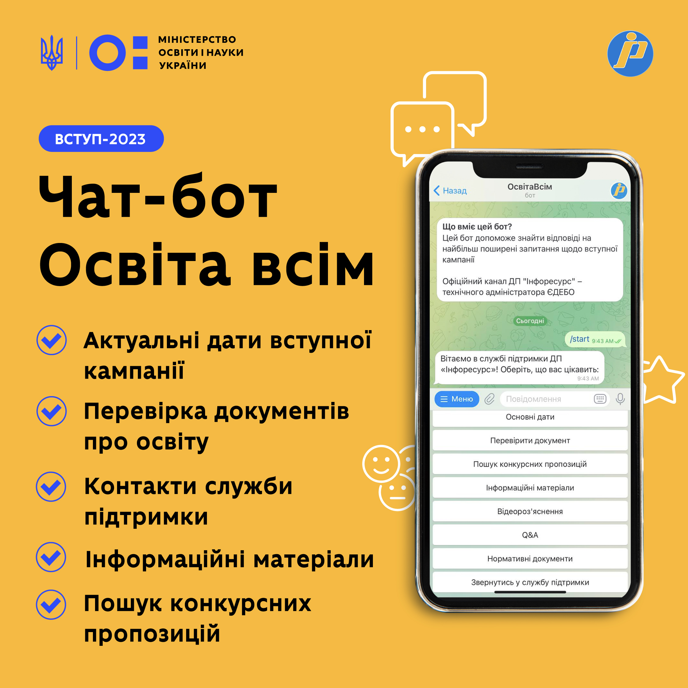 Основні дати вступної кампанії, контакти служби підтримки, роз'яснення щодо онлайн-вступу — усе це і навіть більше у чат-боті «ОсвітаВсім», створеному ДП «Інфоресурс» Ви точно не заплутаєтеся!