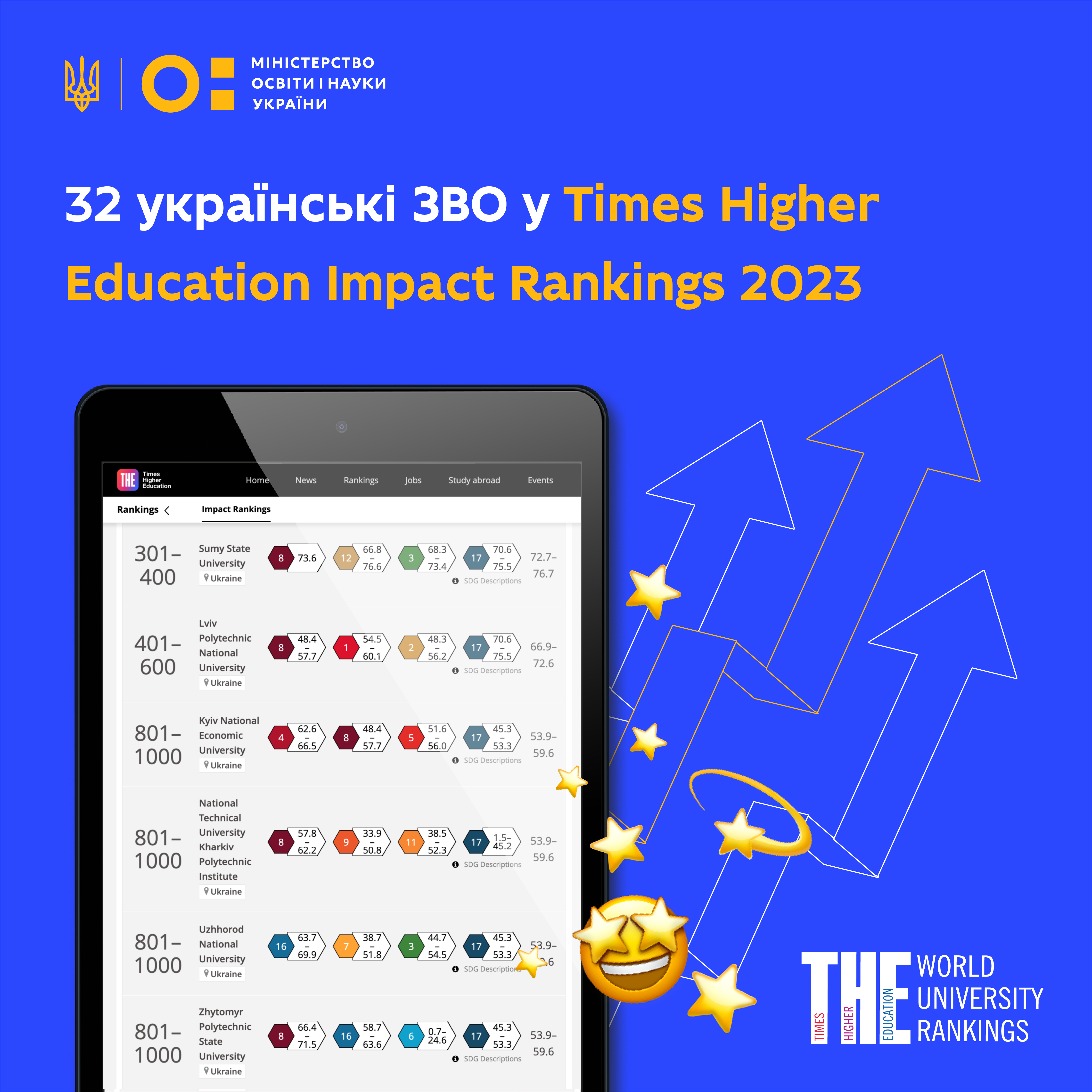 Такий рейтинг роблять щороку, щоб оцінити здобутки найкращих університетів світу у досягненні Цілей сталого розвитку ООН. У 2023 до списку увійшла рекордна кількість українських ЗВО. Серед 1591 закладів вищої освіти зі 112 країн світу опинились і 32 українські університети!