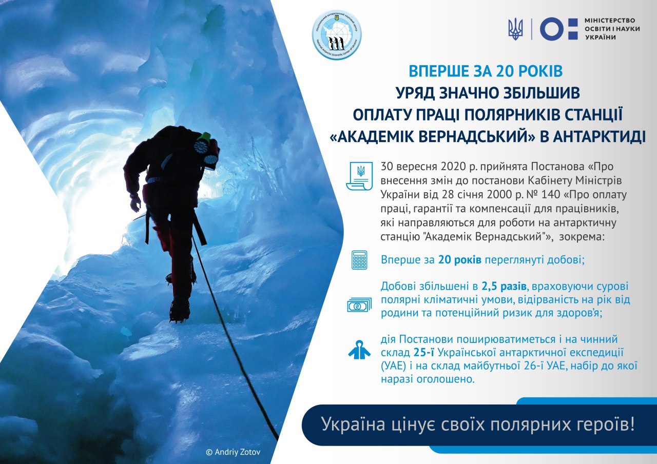 Сьогодні, 30 вересня 2020 року, Урядом прийняті зміни до нормативного акта, які дозволять збільшити оплату праці полярників (добові) у два з половиною рази порівняно із чинною. Відтепер вона складатиме близько 54 тис гривень на місяць. Про це повідомив т.в.о. Міністра освіти і науки України Сергій Шкарлет.