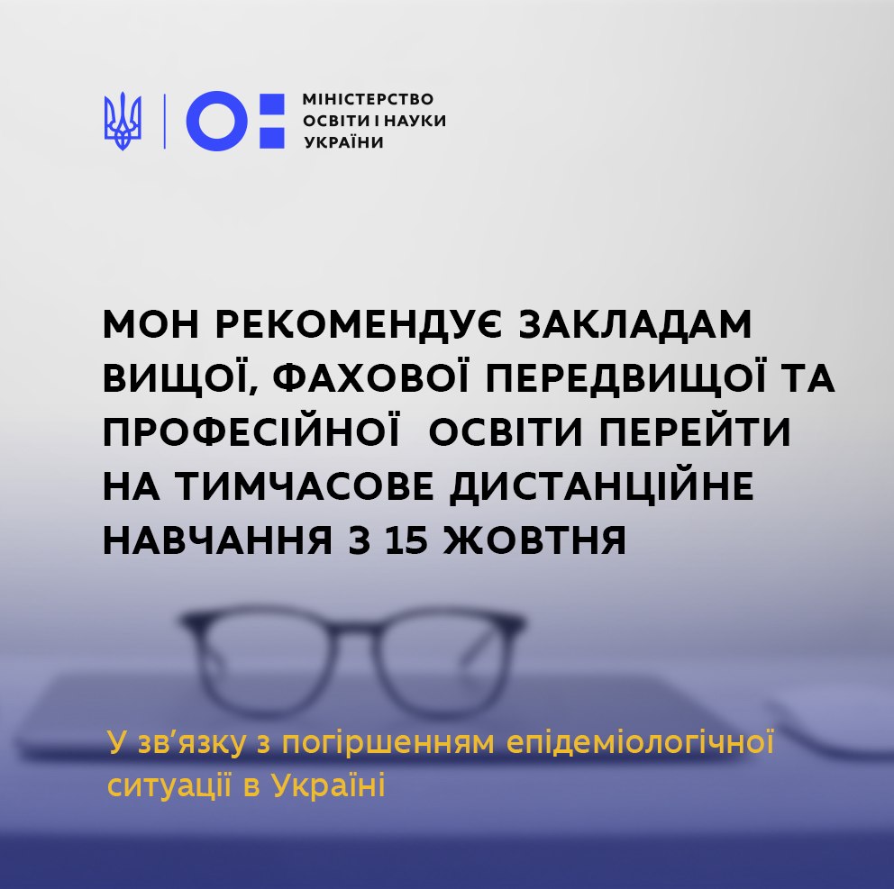 У зв’язку з погіршенням епідеміологічної ситуації в Україні, спричиненої поширенням коронавірусної хвороби (COVID-19), Міністерство освіти і науки України рекомендує запровадити дистанційне навчання в закладах вищої, фахової передвищої, професійної (професійно-технічної) освіти з 15 жовтня до 15 листопада 2020 року.