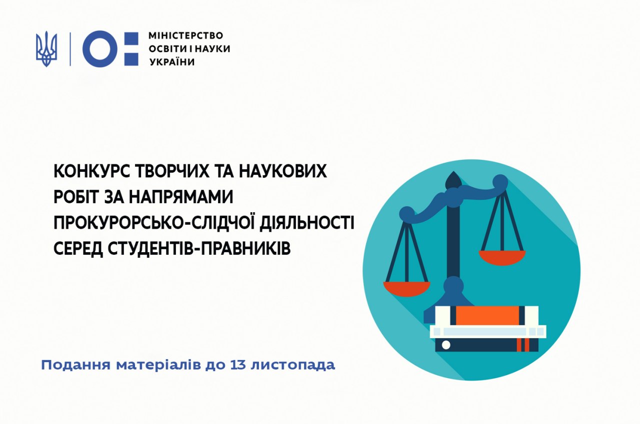 Тренінговий центр прокурорів України спільно з Офісом Генерального прокурора та Міністерством освіти і науки України запрошують взяти участь у конкурсі творчих та/або наукових робіт за напрямами прокурорсько-слідчої діяльності серед студентів, які навчаються за спеціальністю 081 «Право» у закладах вищої освіти, на тему: «ПРОКУРАТУРА ТА ГРОМАДСЬКІ АКТИВІСТИ: ЧИ МОЖЛИВЕ НАЛАГОДЖЕННЯ ВЗАЄМОДІЇ».