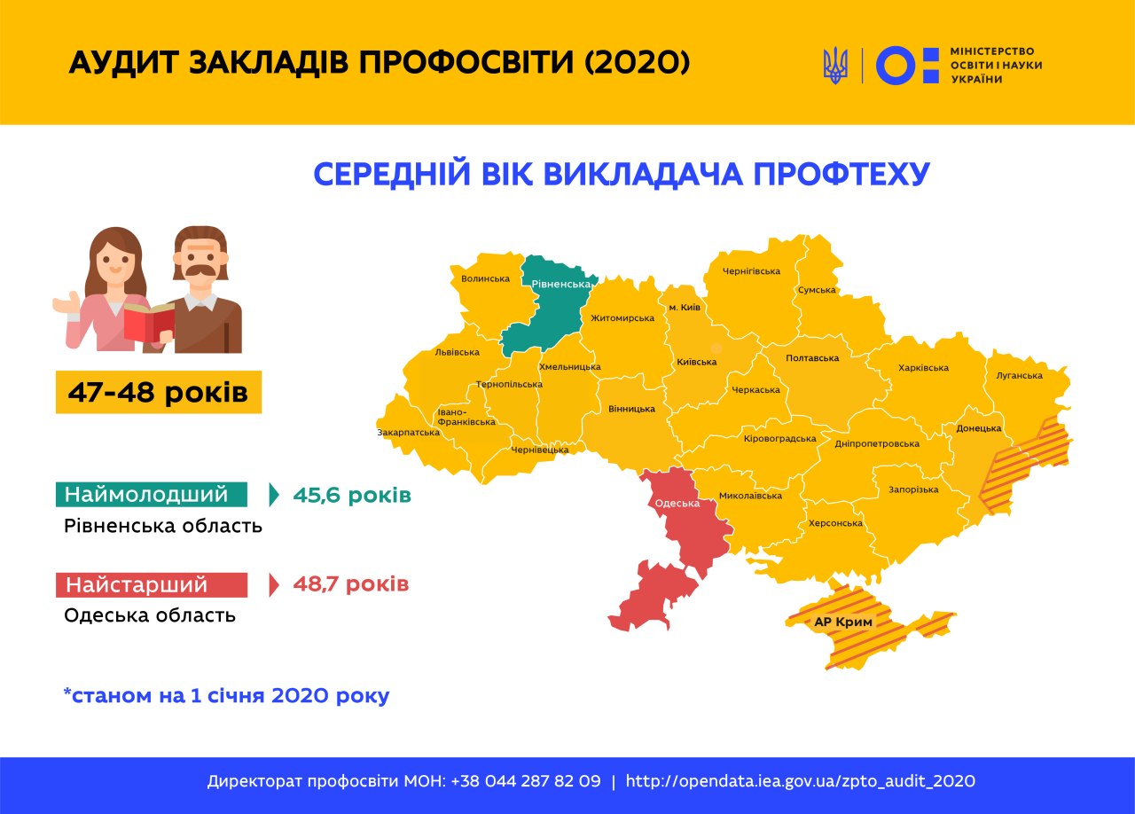 За даними аудиту профосвіти, середній вік викладача – 47-48 років. Найменший середній вік зафіксовано в Рівненській області (45,6 років), а найбільший – в Одеській (48,7 років).